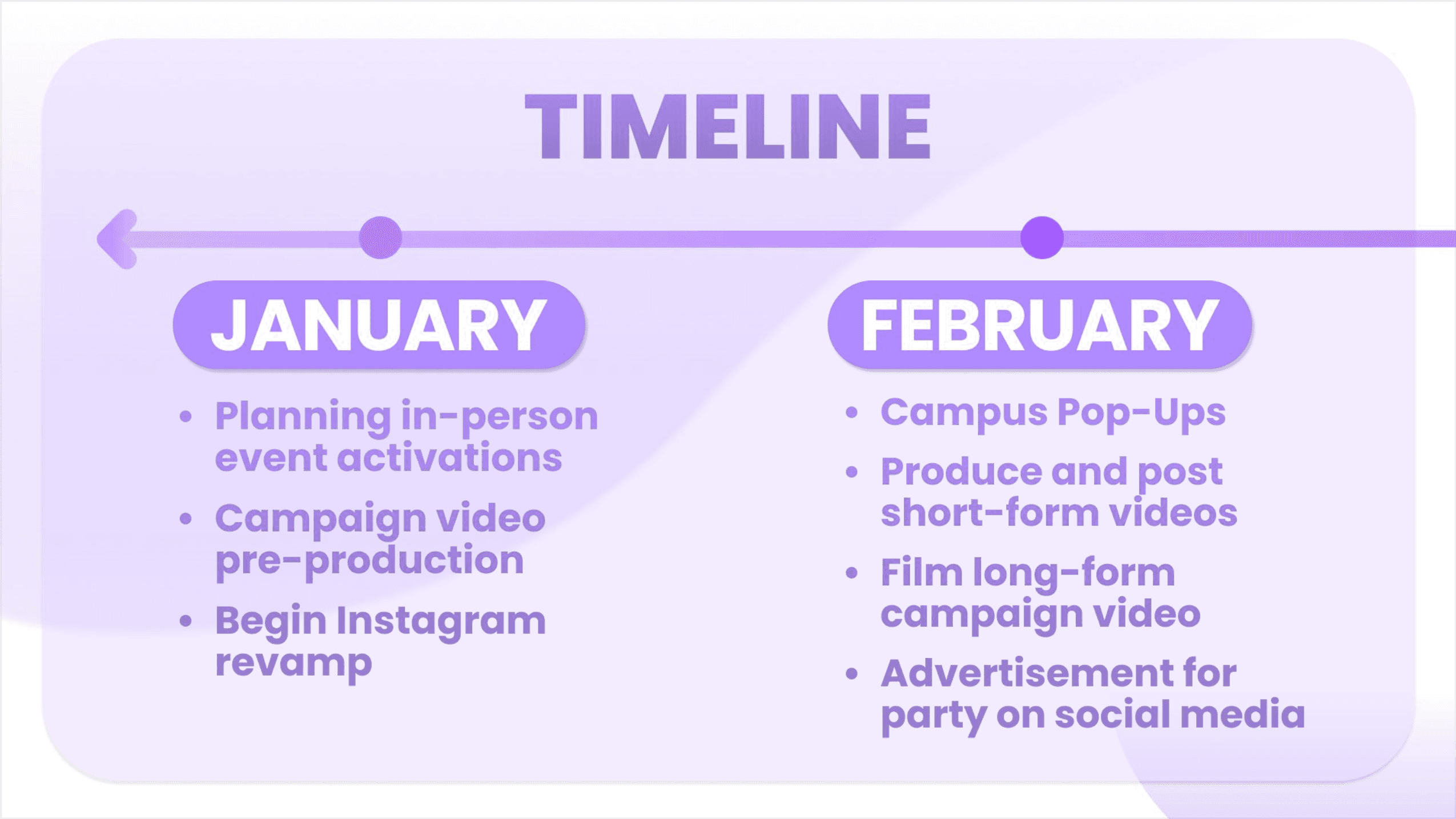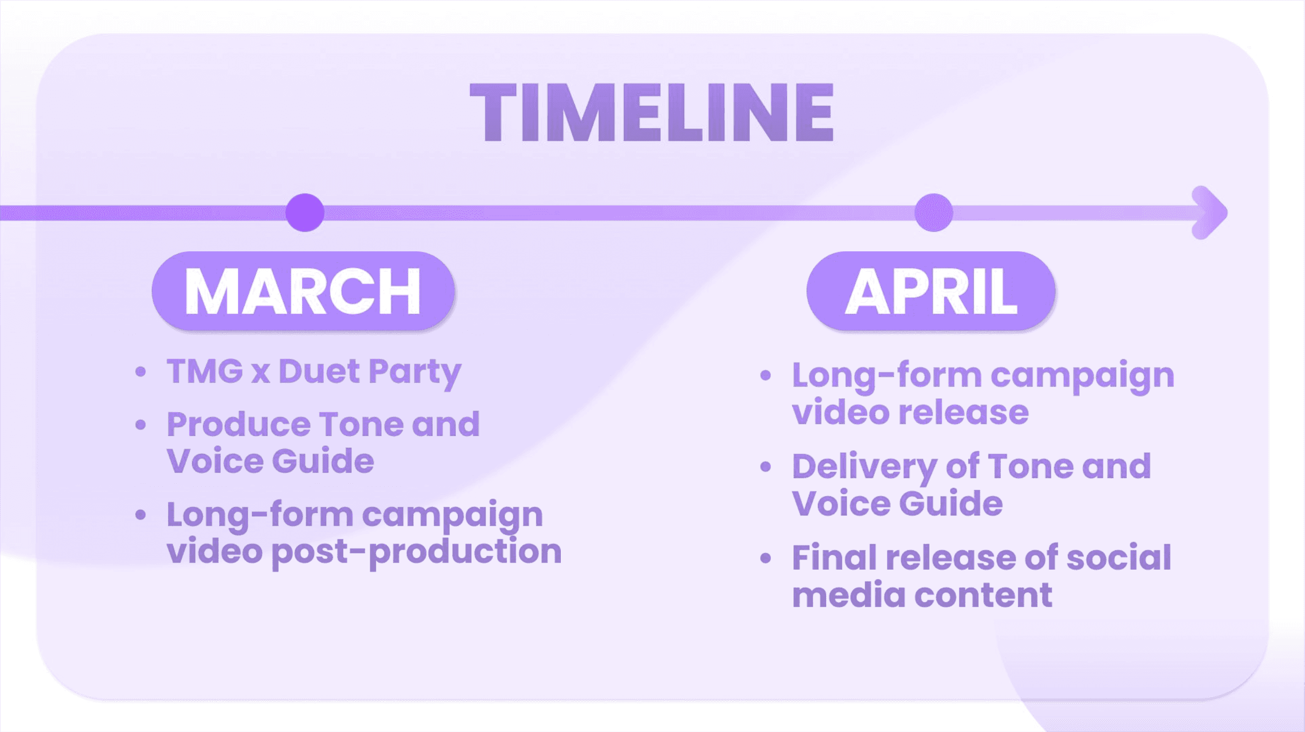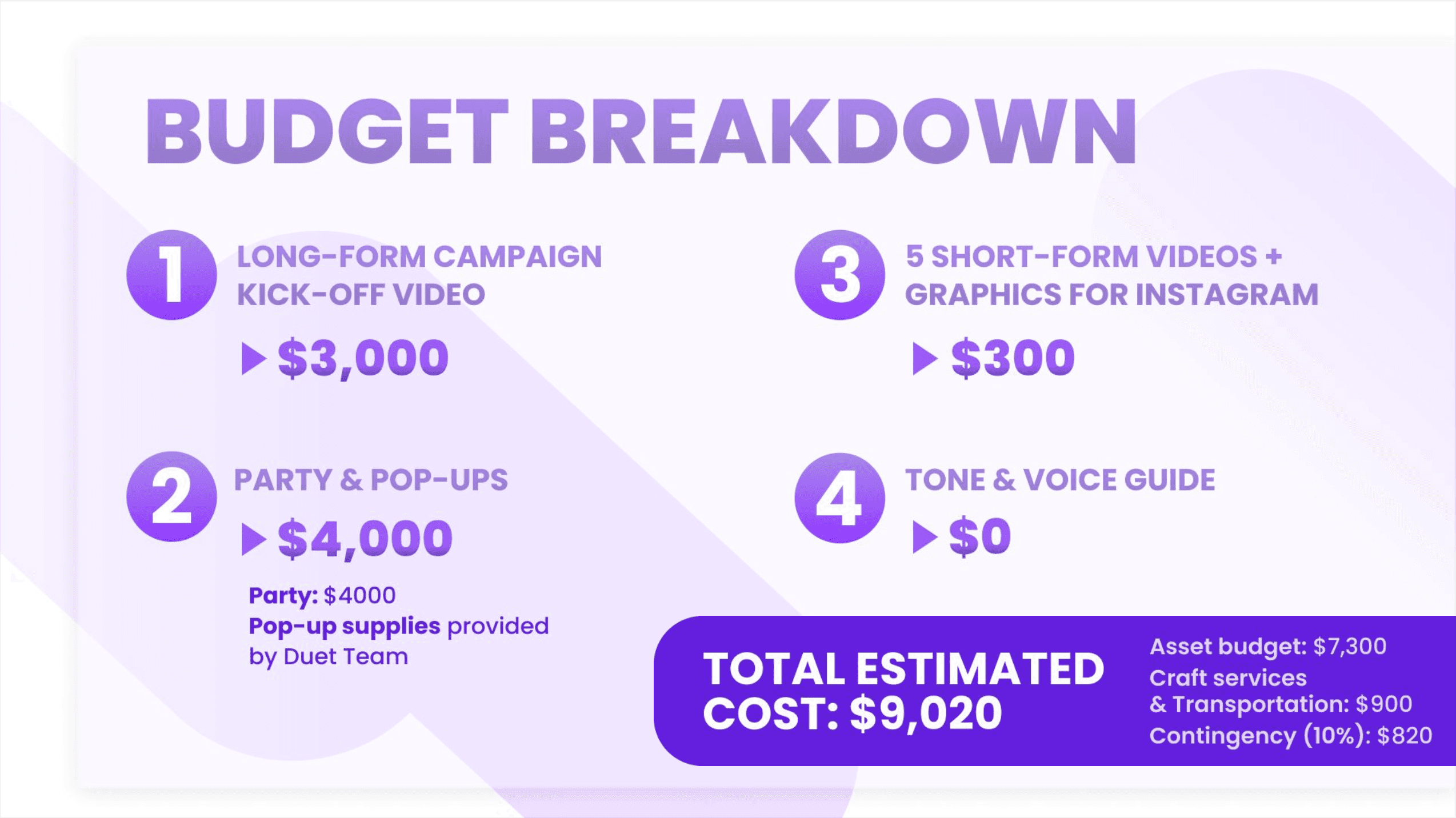 Our campaign assets consisted of an interactive pop-up event at USC, a TMG x Duet party, and short-form promotional content. We mapped out a budget breakdown and timeline accordingly.