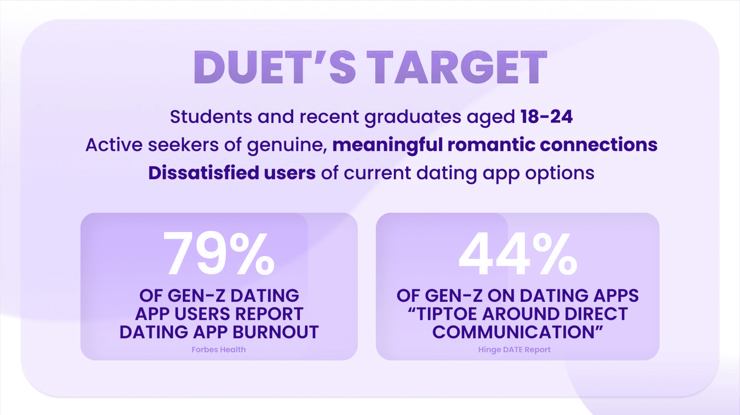 Breaking into the U.S. dating market meant competing in an already saturated space, where most apps rely on surface-level interactions. Duet needed to stand out in a way that felt more intentional to a Gen Z audience.